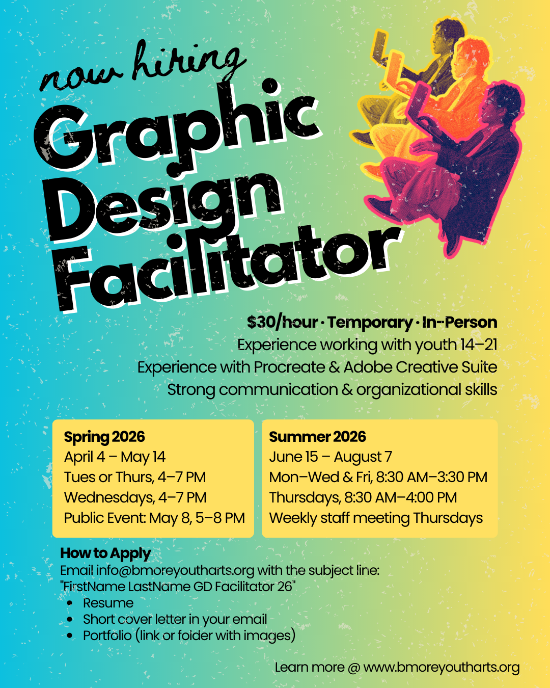 Baltimore Youth Arts is seeking a Graphic Design Facilitator to support Apprentices in the Spring/Summer 2026 Apprentice Program. This role facilitates workshop-style classes. BYA's project-based curriculum will engage youth in developing a collaborative coloring book and a commissioned public art installation exploring how young people envision Baltimore's Inner Harbor over the next century, in partnership with the National Aquarium.